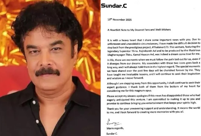 ஆனால், அதே உற்சாகத்தை நொறுக்கிவிட்டார் இயக்குநர் சுந்தர்.சி.தனது அதிகாரப்பூர்வ அறிக்கையில் அவர்,“மிக கனிந்த இதயத்துடன் சில முக்கியமான விஷயங்களை பகிர்ந்து கொள்கிறேன். எதிர்பாராத மற்றும் தவிர்க்க முடியாத சூழ்நிலைகளின் காரணமாக, ரஜினிகாந்த் நடிக்கும் ‘தலைவர் 173’ படத்திலிருந்து விலகும் கடினமான முடிவை எடுத்துள்ளேன்.