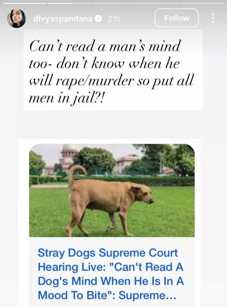 தெருநாய்கள் விவகாரத்தில் உச்சநீதிமன்ற கருத்து; "ஒரு ஆணின் மனதையும் படிக்க முடியாது; எனவே எல்லா ஆண்களையும் சிறையில் அடைக்கலாமா?" நடிகை திவ்யா ஸ்பந்தனா..!