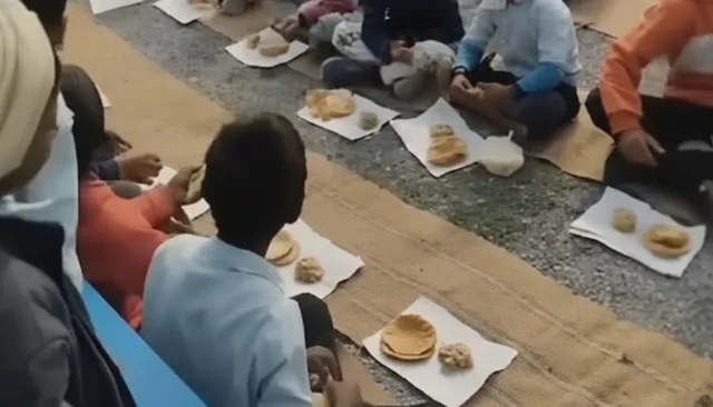 மாணவர்களுக்கு தட்டுகள் இல்லாததால், நோட்டு மற்றும் புத்தகக் காகிதங்களில் உணவு பரிமாறப்பட்ட சம்பவம் சமூக வலைதளங்களில் வெளியாகி வைரலாகி, கடும் கண்டனத்தை குவித்து வருகிறது.