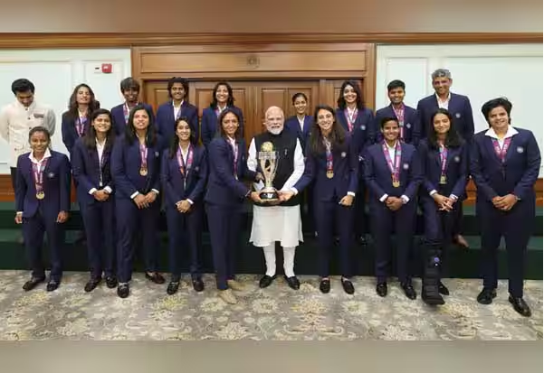 Indian womens cricket team congratulates Prime Minister Modi with World Cup trophy
