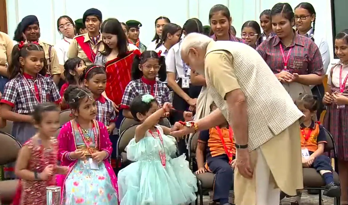 ரக்சா பந்தன் கொண்டாட்டம் - பிரதமர் மோடிக்கு ராக்கி கட்டி மகிழ்ந்த பள்ளி மாணவர்கள்.!