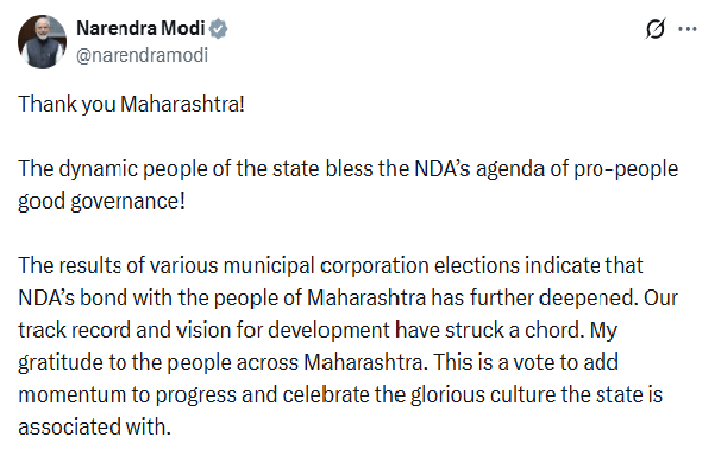 புனே உள்ளிட்ட மாநகராட்சியிலும் பாஜக வெற்றி பெற்றுள்ளது. இந்த வெற்றி குறித்து, பிரதமர் மோடி தனது எக்ஸ் பக்கத்தில் பத்துவிட்டுள்ளதாவது;
