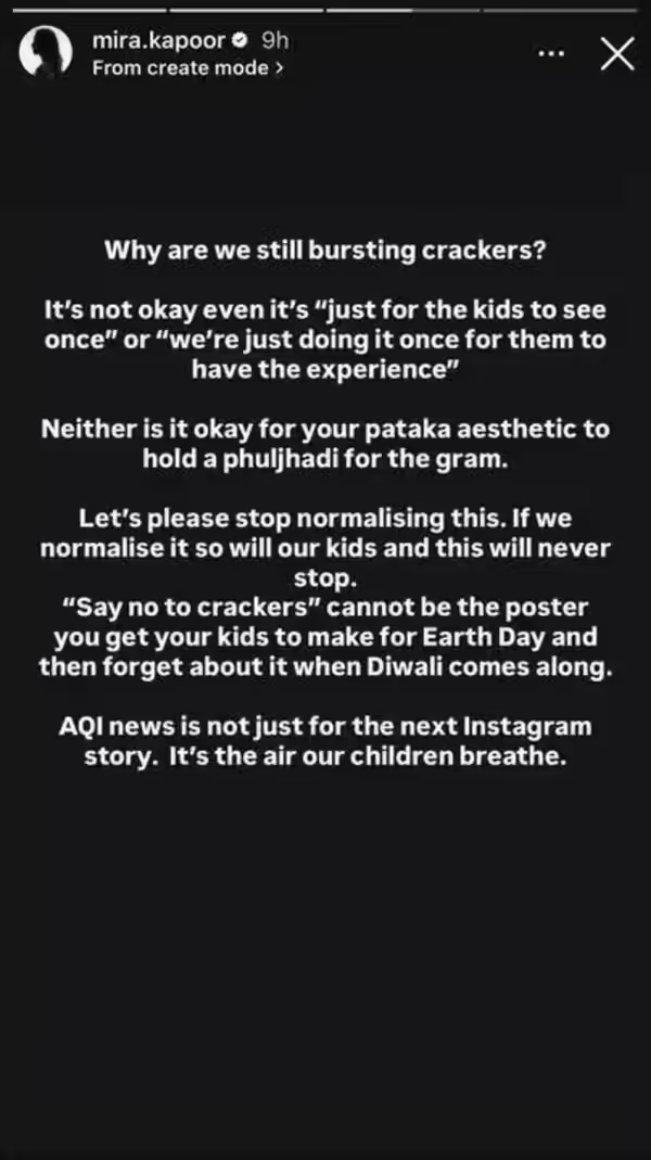 அதில், 'பட்டாசு வெடிப்பதை சாதாரணமாக மாற்றுவதை ஏன் இன்னும் நிறுத்தவில்லை? குழந்தைகளுக்காகத்தான் செய்கிறோம் என்பதை ஏற்க முடியாது. நமது குழந்தைகள் சுவாசிக்கும் காற்றின் தரக் குறியீடு குறித்து நாம் கவலைப்பட வேண்டும். புவி தினத்தில் சுற்றுச்சூழலைப் பற்றிப் பேசிவிட்டு, தீபாவளியின் போது சுற்றுச்சூழலை மாசுபடுத்தும் செயல்களில் ஈடுபடுவது ஏன்?' என்று அவர் கேள்வி எழுப்பியிருந்தார்.