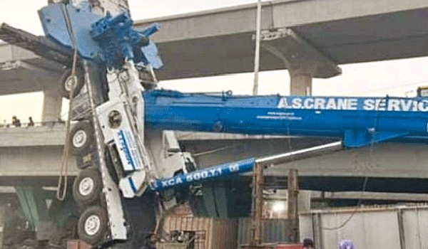 இந்நிலையில், கிரேனுடன் இணைக்கப்பட்டிருந்த நான்கு ஜாக்குகளில் ஒன்று திடீரென துண்டிக்கப்பட்டதாக கூறப்படுகிறது. இதன் விளைவாக சமநிலையை இழந்த அந்தப் பெரும் கிரேன், கணநேரத்தில் கவிழ்ந்து விழுந்தது.