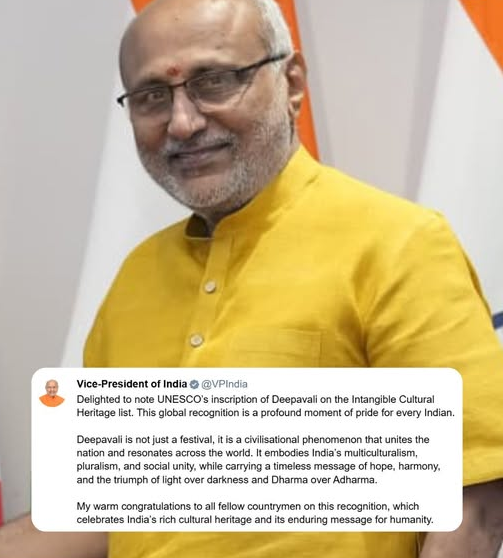 தீபாவளி பண்டிகையை யுனெஸ்கோ அமைப்பின் கலாசார பாரம்பரிய பட்டியலில் சேர்த்துள்ளமை நம் நாட்டிற்கு கிடைத்த மிகுந்த பெருமைக்குரிய தருணம் என்று துணை ஜனாதிபதி சி.பி.ராதாகிருஷ்ணன் பாராட்டியுள்ளார்.