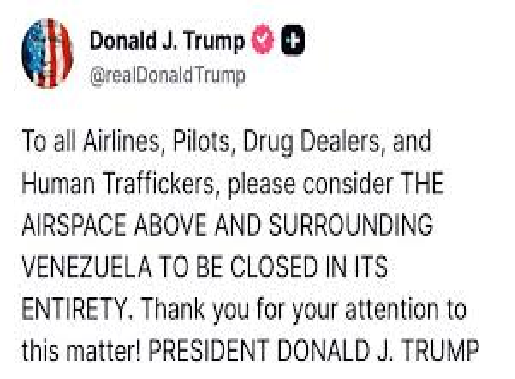 அத்துடன், வெனிசுலாவுக்கு எதிராக ராணுவ நடவடிக்கைகள் எடுப்பது குறித்து டிரம்பிடம் ராணுவ அதிகாரிகள் ஆலோசனை நடத்தியுள்ளனர். இந்நிலையில், 'வெனிசுலா நாட்டு வான்வெளி மற்றும் அதை சுற்றியுள்ள வான்வெளி மூடப்படுவதாகவும், அங்கே எந்த விமானமும் பறக்கக் கூடாது என டிரம்ப் அறிவித்துள்ளார்.
