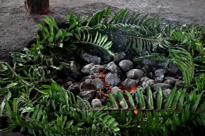 முதலில் மண்ணில் ஒரு பெரிய குழி தோண்டி, அதில் கற்களை வைத்து நன்றாக சூடாக்கவும்.