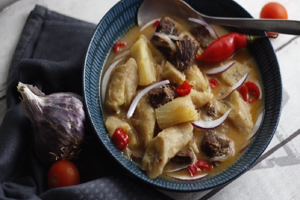 கோமொரியாவில் இது பொதுவாக மசாலா சாஸ் மற்றும் ரொட்டி உடன் பரிமாறப்படுகிறது.