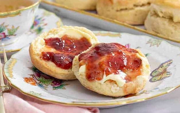 வெப்பமுள்ள ஸ்கோன்ஸை ஜாம் மற்றும் கிளாட்டெட் கிரீம் சேர்த்து பரிமாறுங்கள்.