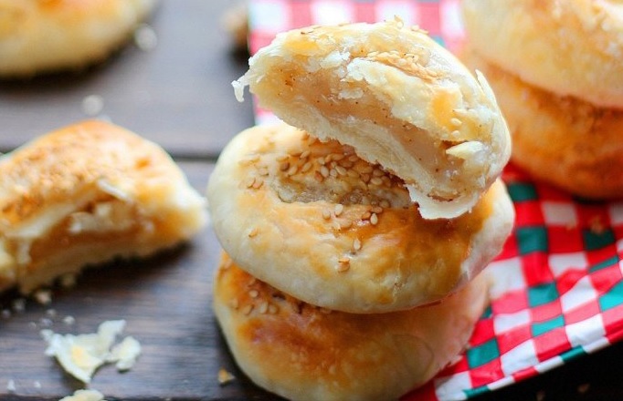 பாஸ்ட்ரி தோலில் சிறிய துண்டுகளை வெட்டி, வெள்ளைக்காய் கலவை நிரப்பி மூடி, வட்ட வடிவில் அடுக்கவும்.