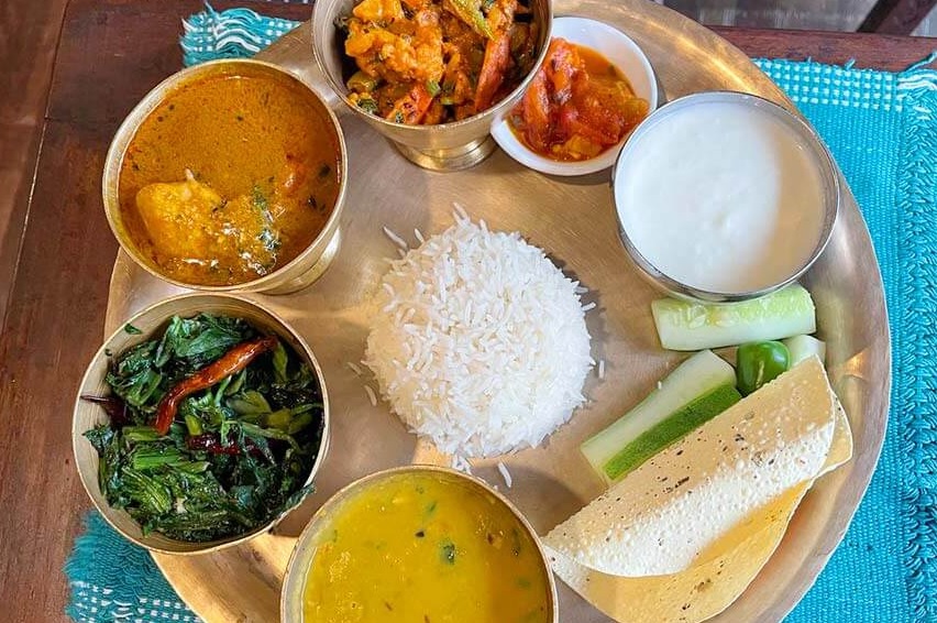 Rice lentils curry salad pickle Dal Bhat cultural aroma Nepal