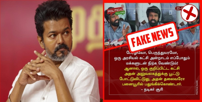 "பேரழவோ, பெருந்துயரமோ, ஒரு அரசியல் கட்சி அன்றாடம் எப்போதும் மக்களுடன் நிற்க வேண்டும்! ஆனால், ஒரு குறிப்பிட்ட கட்சி அதன் அலுவலகத்துக்கு பூட்டு போட்டுவிட்டுது, அதன் தலைவரோ பனையூரில் பதுங்கிக்கொண்டார்" என்று நடிகர் சூரி பேட்டி அளித்துள்ளதாக சமூகவலைத்தளமான எக்ஸ் பக்கத்தில் ஒரு செய்தி பரவி வந்தது.