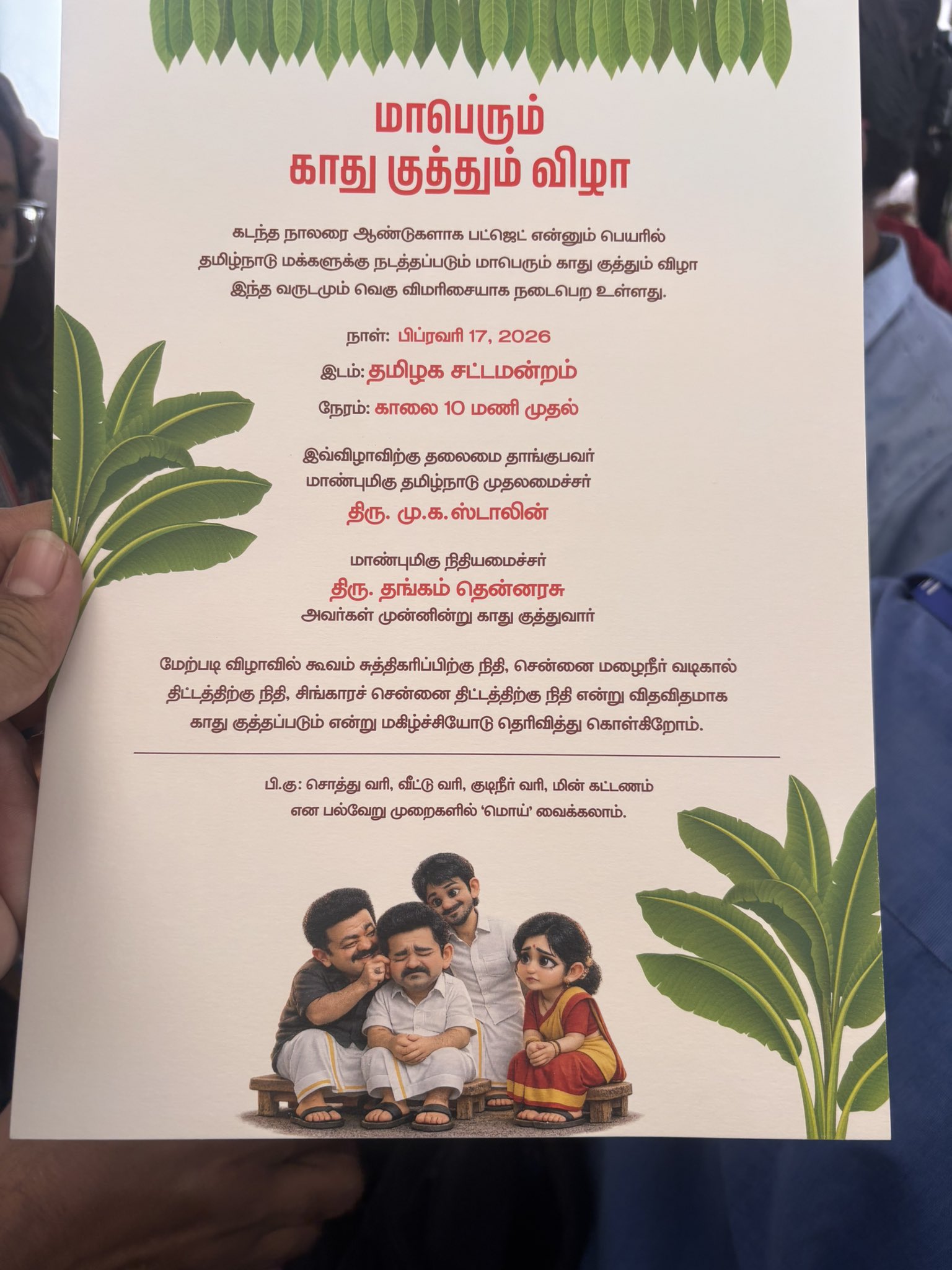 கிண்டல் அழைப்பிதழ்: கடந்த 4.5 ஆண்டுகளைப் போல இப்போதும் மக்களை ஏமாற்றவே இந்த பட்ஜெட் என அவர்கள் சாடியுள்ளனர்.