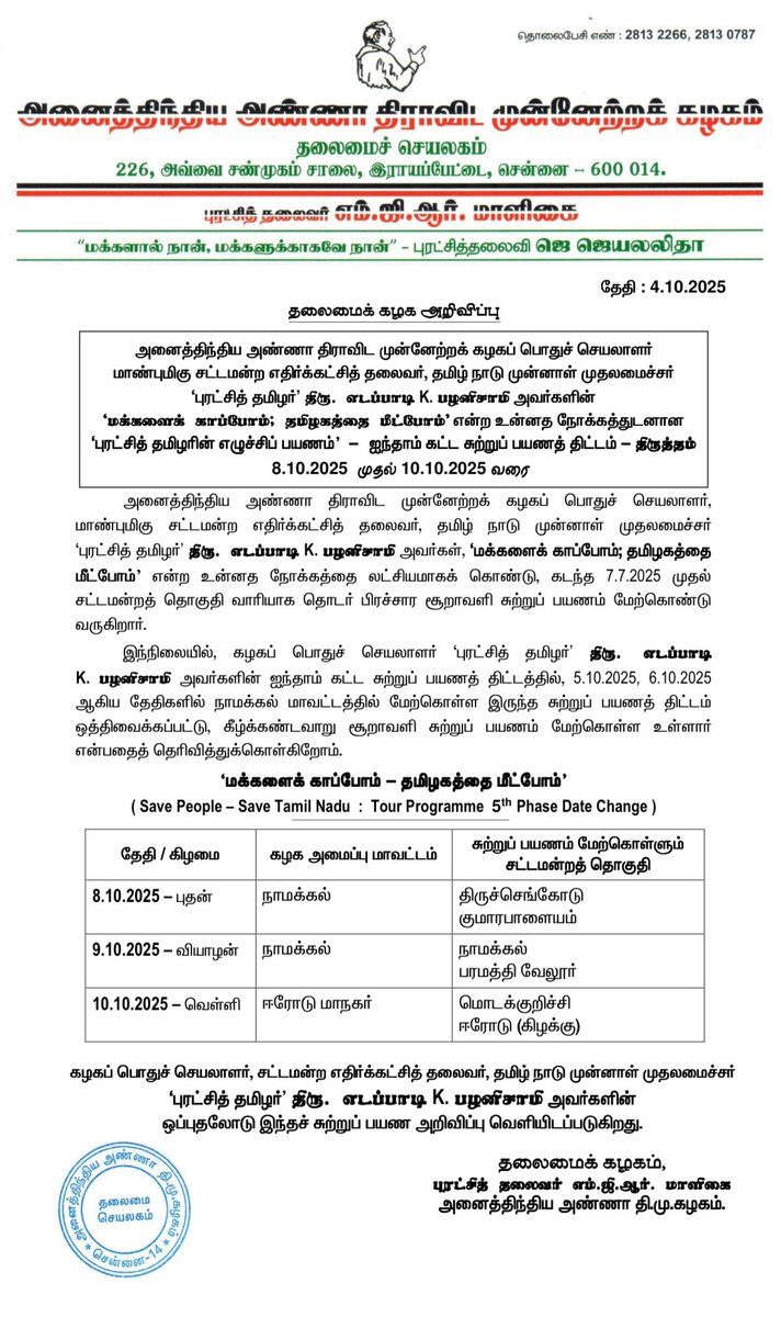 பிரசார நிகழ்வுக்கு இன்னும் ஒரு நாளே இருந்த நிலையில், இடம் தொடர்பான சிக்கல்கள் காரணமாக ரத்து செய்யப்பட்டிருப்பது அதிமுகவினரிடையே அதிருப்தியை ஏற்படுத்தி இருந்த நிலையில், தற்போது மாற்று தேதியை அதிமுக தலைமை வெளியிட்டுள்ளது.