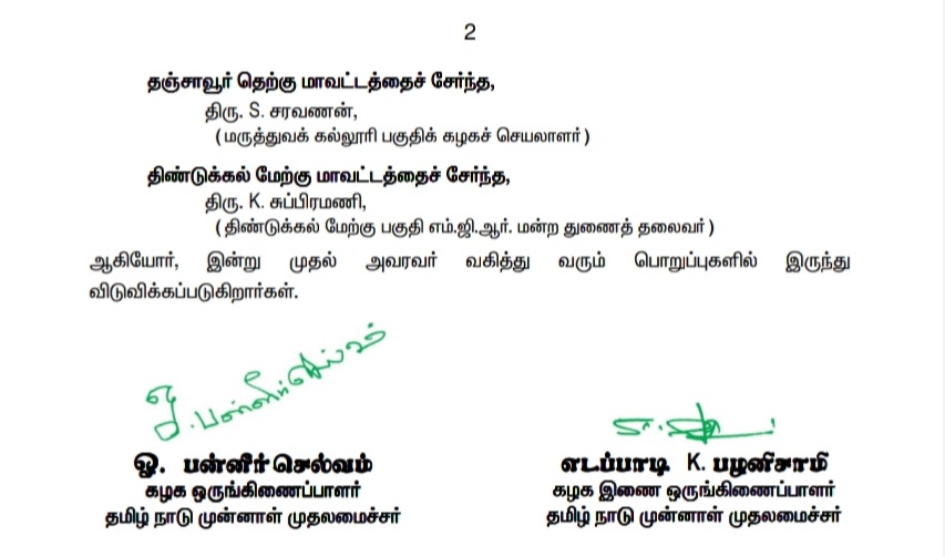 திண்டுக்கல் மேற்கு மாவட்டத்தைச் சேர்ந்த, K. சுப்பிரமணி (திண்டுக்கல் மேற்கு பகுதி எம்.ஜி.ஆர். மன்ற துணைத் தலைவர்) ஆகியோர் இன்று முதல் அவரவர் வகித்து வரும் பொறுப்புகளில் இருந்து விடுவிக்கப்படுகிறார்கள்.