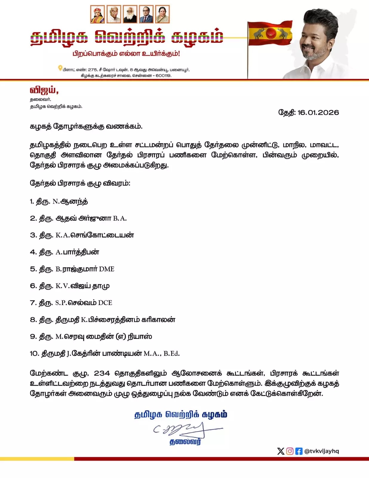 சட்டமன்றத் தேர்தல் களம்: 10 பேர் பிரசாரக் குழுவை அறிவித்த தவெக தலைவர் விஜய்...!