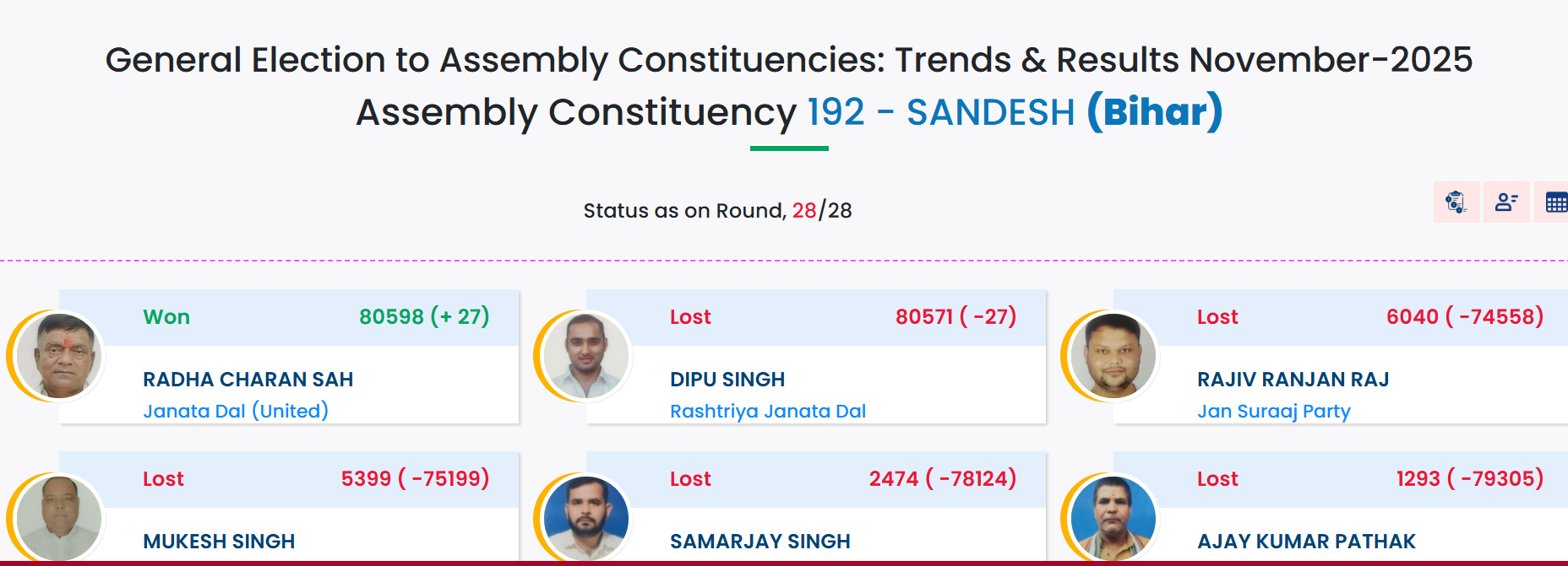 சந்தேஷ் தொகுதியில் 27 வாக்குகள் வித்தியாசத்தில் ராஷ்டிரிய ஜனதா தள வேட்பாளர் தோல்வியை தழுவியுள்ளார்.