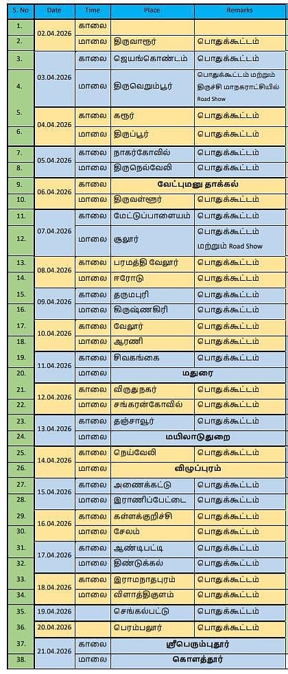 ஏப்ரல் 2ஆம் தேதி திருவாரூரில் பிரச்சாரத்தை தொடங்கி, ஏப்ரல் 21ஆம் தேதி கொளத்தூரில் இறுதிக்கட்ட பிரச்சாரத்தை நிறைவு செய்ய உள்ளார். இதன் மூலம் தேர்தல் களம் மேலும் தீவிரமடையும் என எதிர்பார்க்கப்படுகிறது.