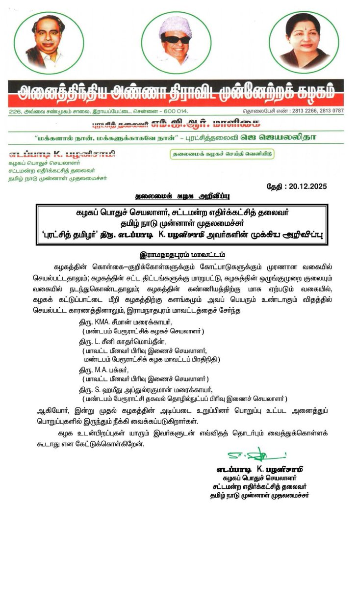 அதிமுகவின் கொள்கை-குறிக்கோள்களுக்கும், கோட்பாடுகளுக்கும் முரணான வகையில் செயல்பட்டதாலும், அதிமுகவின் சட்ட திட்டங்களுக்கு மாறுபட்டு, ஒழுங்குமுறை குலையும் வகையில் நடந்துகொண்டதாலும், கண்ணியத்திற்கு மாசு ஏற்படும் வகையில், கட்டுப்பாட்டை மீறி களங்கமும் அவப் பெயரும் உண்டாகும் விதத்தில் செயல்பட்ட காரணத்தினாலும், இராமநாதபுரம் மாவட்டத்தைச் சேர்ந்த மண்டபம் பேரூராட்சிக் கழகச் செயலாளர் கே.எம்.ஏ.சீமான் மரைக்காயர், மாவட்ட மீனவர் பிரிவு இணைச் செயலாளரும், மண்டபம் பேரூராட்சிக் கழக மாவட்டப் பிரதிநிதியுமான எல்.சீனி காதர் மொய்தீன், மாவட்ட மீனவர் பிரிவு இணைச் செயலாளர் எம்.ஏ.பக்கர், மண்டபம் பேரூராட்சி தகவல் தொழில்நுட்பப் பிரிவு இணைச் செயலாளர் ஹமீது அப்துல் ரகுமான் மரைக்காயர் ஆகியோர், இன்று முதல் கழகத்தின் அடிப்படை உறுப்பினர் பொறுப்பு உட்பட அனைத்துப் பொறுப்புகளில் இருந்தும் நீக்கி வைக்கப்படுகிறார்கள். அதிமுகவினர் யாரும் இவர்களுடன் எவ்விதத் தொடர்பும் வைத்துக்கொள்ளக் கூடாது’’ என அறிவித்துள்ளார்.