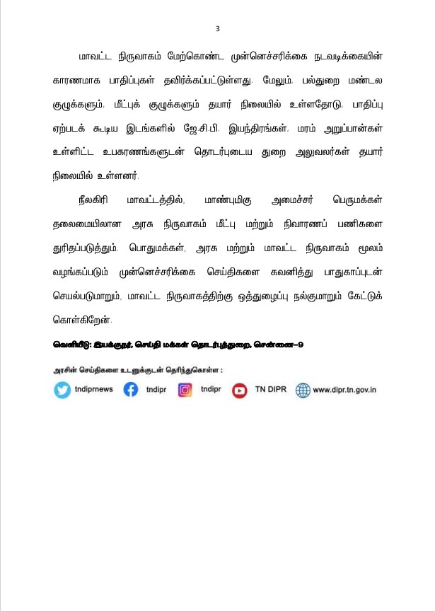 நீலகிரி மாவட்டத்தில், மாண்புமிகு அமைச்சர் பெருமக்கள் தலைமையிலான அரசு நிருவாகம் மீட்பு மற்றும் நிவாரணப் பணிகளை துரிதப்படுத்தும். பொதுமக்கள், அரசு மற்றும் மாவட்ட நிருவாகம் மூலம் வழங்கப்படும் முன்னெச்சரிக்கை செய்திகளை கவனித்து பாதுகாப்புடன் செயல்படுமாறும், மாவட்ட நிருவாகத்திற்கு ஒத்துழைப்பு நல்குமாறும் கேட்டுக் கொள்கிறேன்.