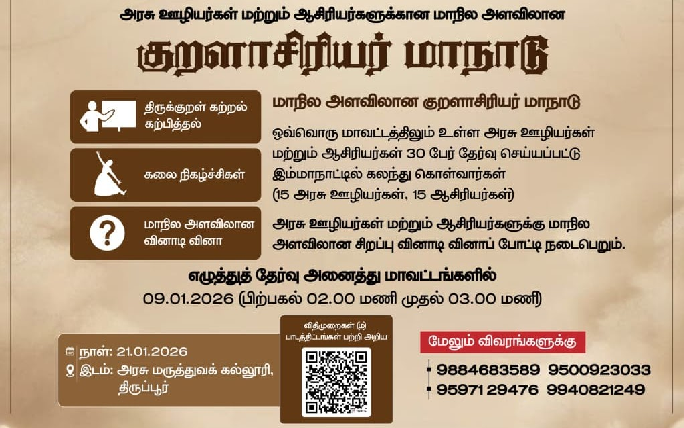 அதன் அடிப்படையில், தமிழ் வளர்ச்சித் துறையின் சார்பில், திருப்பூர் மாவட்ட நிருவாக ஒருங்கிணைப்பில், மாநில அளவிலான திருக்குறள் வினாடி வினாப் போட்டி மற்று குறளாசிரியர் மாநாடு திருப்பூர் அரசு மருத்துவக் கல்லூரி கலையரங்கில் 21.01.2026 புதன் கிழமை நடைபெறவுள்ளது.