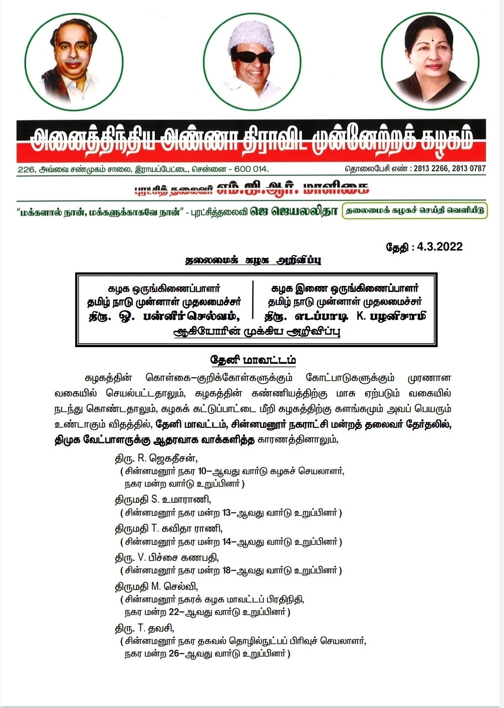 R. ஜெகதீசன் (சின்னமனூர் நகர 10-ஆவது வார்டு கழகச் செயலாளர், நகர மன்ற வார்டு உறுப்பினர்), S. உமாராணி (சின்னமனூர் நகர மன்ற 13-ஆவது வார்டு உறுப்பினர்), T. கவிதா ராணி (சின்னமனூர் நகர மன்ற 14-ஆவது வார்டு உறுப்பினர்) , V. பிச்சை கணபதி (சின்னமனூர் நகர மன்ற 18-ஆவது வார்டு உறுப்பினர்), M. செல்வி (சின்னமனூர் நகரக் கழக மாவட்டப் பிரதிநிதி, நகர மன்ற 22-ஆவது வார்டு உறுப்பினர்) , T. தவசி (சின்னமனூர் நகர தகவல் தொழில்நுட்பப் பிரிவுச் செயலாளர், நகர மன்ற 26-ஆவது வார்டு உறுப்பினர்), P. ராஜேந்திரன் (திமுக-விற்கு ஆதரவாக செயல்பட்டவர்) (சின்னமனூர் நகரக் கழகச் செயலாளர்) ஆகியோர், இன்று முதல் கழகத்தின் அடிப்படை உறுப்பினர் பொறுப்பு உட்பட அனைத்துப் பொறுப்புகளில் இருந்தும் நீக்கி வைக்கப்படுகிறார்கள்.