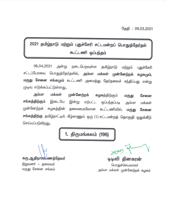 அம்மா மக்கள் முன்னேற்றக் கழகத்திற்கும் மருது சேனை சங்கத்திற்கும் இடையே இன்று ஏற்பட்ட ஒப்பந்தப்படி அம்மா மக்கள் முன்னேற்றக் கழகத்தின் தலைமையிலான கூட்டணியில், மருது சேனை சங்கத்திற்கு தமிழ்நாட்டில் கீழ்காணும் ஒரு (1) சட்டமன்றத் தொகுதி ஒதுக்கீடு செய்யப்படுகிறது. இதன்படி, திருமங்கலம் தொகுதி மருது சேனை சங்கத்திற்கு ஒதுக்கீடு செய்யப்பட்டுள்ளது.