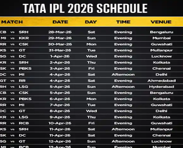 அதன்படி, பெங்களூரு சின்னசாமி மைதானத்தில் மார்ச் 28-ஆம் தேதி நடைபெறவுள்ள 2026 ஐ.பி.எல். தொடரின் முதல் போட்டியில் நடப்பு சாம்பியன் பெங்களூரு அணியுடன் ஐதராபாத் அணி மோதுகிறது. 05 மாநில தேர்தல் தேதி அறிவிப்புக்கு பிறகு மீதமுள்ள அட்டவணை வெளியாகும் என்று அறிவிக்கப்பட்டுள்ளது.