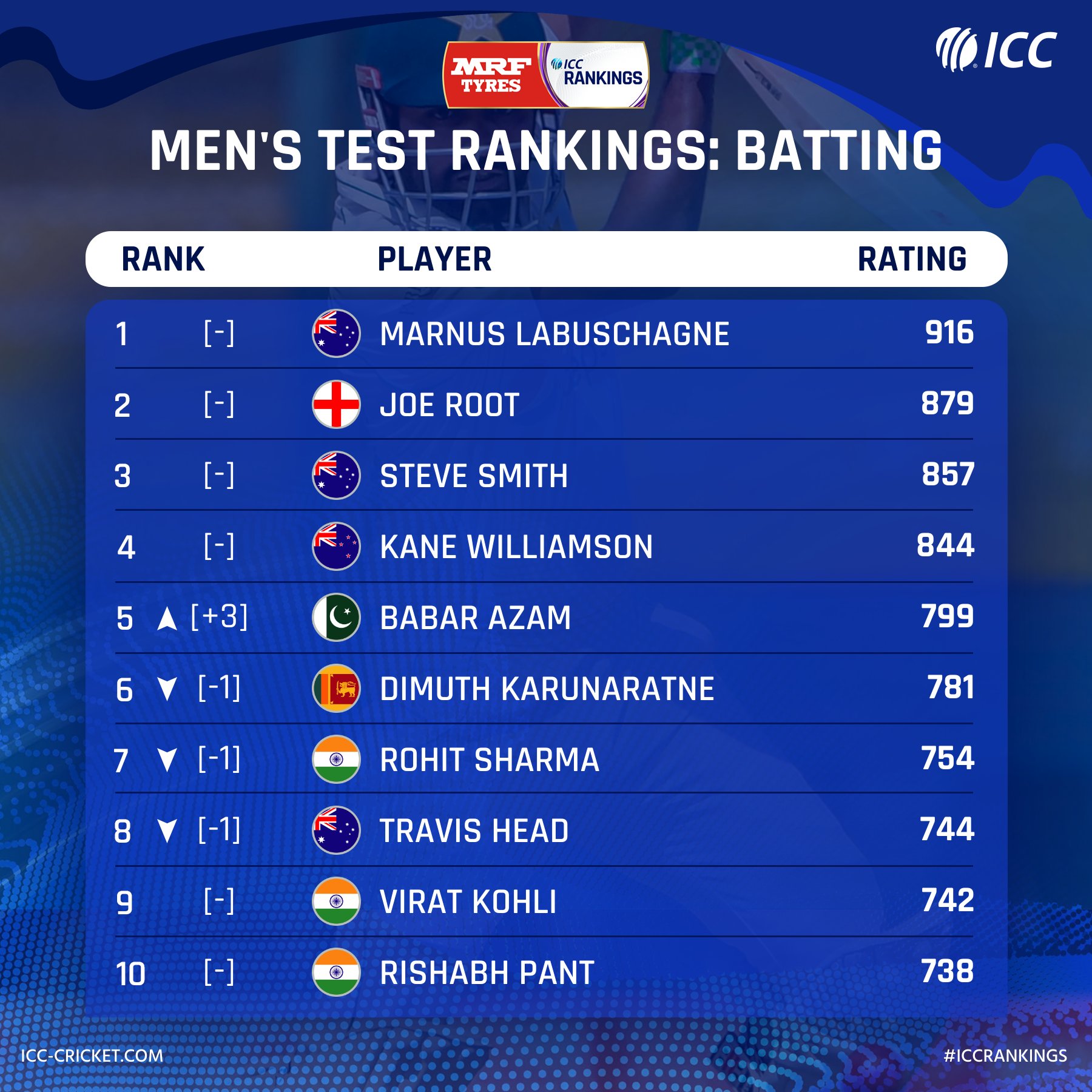ஐசிசி டெஸ்ட் கிரிக்கெட் வீரர்களின் புதிய தரவரிசை பட்டியலை நேற்று வெளியிட்டது. அதன்படி, பேட்ஸ்மேன்கள் தரவரிசை பட்டியலில் ஆஸ்திரேலிய வீரர் மார்னஸ் லாபஸ்சாக்னே 916 புள்ளிகளுடன் முதலிடம் பிடித்துள்ளார். இங்கிலாந்து வீரர் ஜோ ரூட் 876 புள்ளிகளுடன் 2வது இடம் பிடித்துள்ளார். ஆஸ்திரேலிய வீரர் ஸ்டீவ் ஸ்மித் 857 புள்ளிகளுடன் மூன்றாவது இடத்தை பிடித்துள்ளார். இந்திய அணியின் கேப்டன் ரோகித் சர்மா 754 புள்ளிகளுடன் 7வது இடத்திலும், விராட்கோலி 742 புள்ளிகளுடன் 8-வது இடத்திலும், ரிஷப் பண்ட் 738 புள்ளிகளுடன் 10வது இடத்திலும் உள்ளார்.