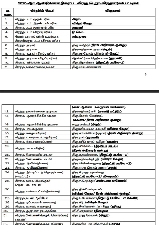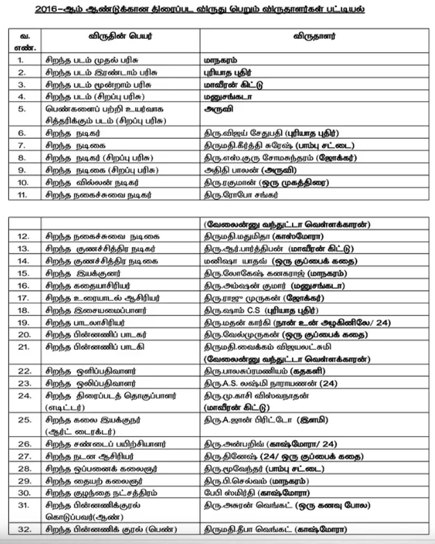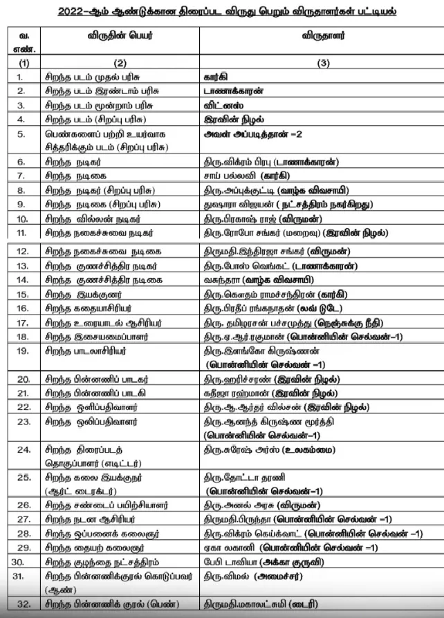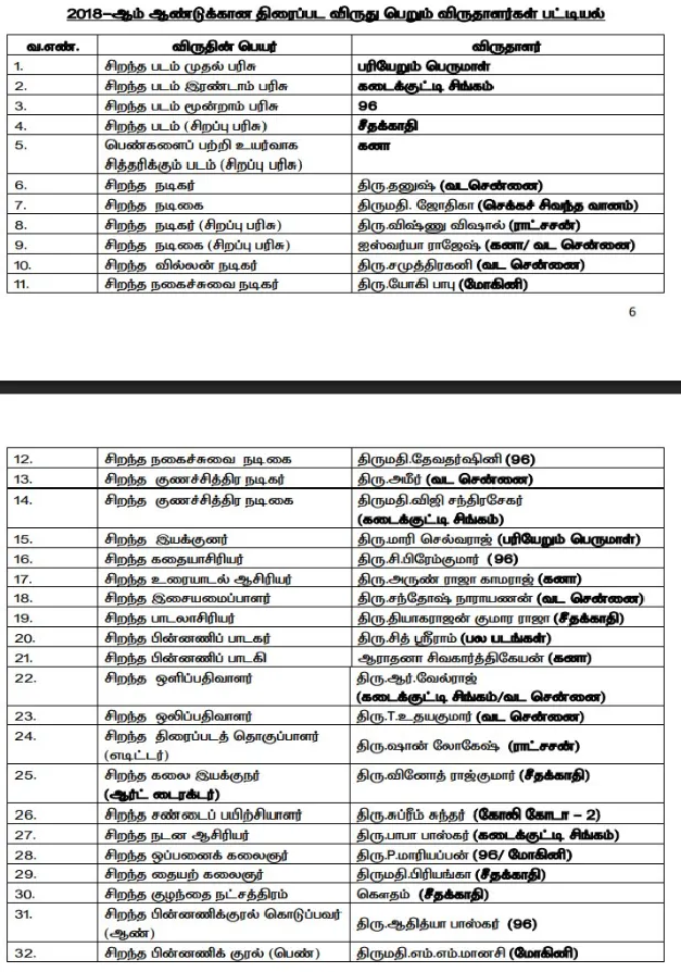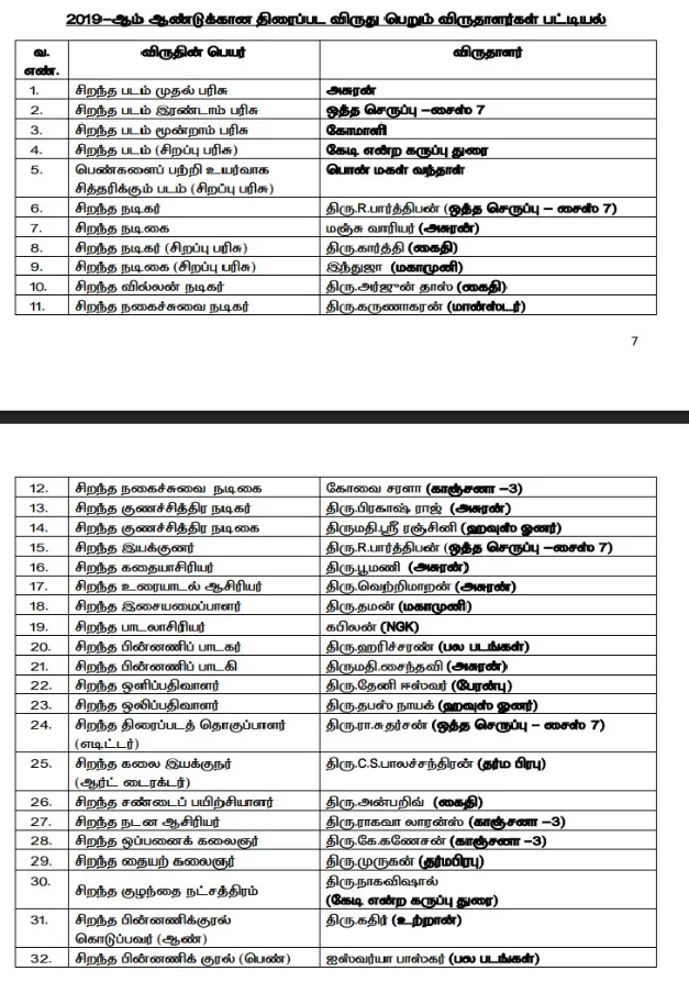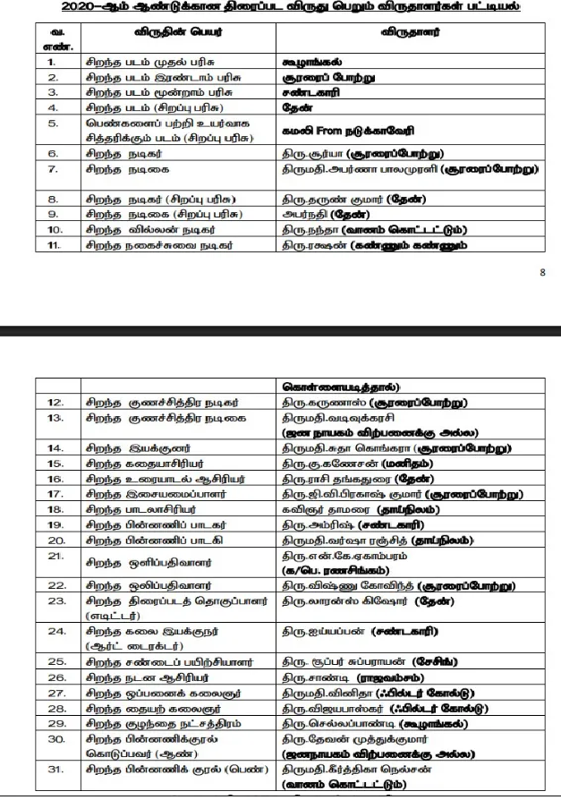 திரைப்பட விருதுகளுக்காக நடிகர்கள் விஜய் சேதுபதி, கார்த்தி, தனுஷ், ஆர்.பார்த்திபன், சூர்யா, ஆர்யா, விக்ரம் பிரபு ஆகியோர் சிறந்த நடிகர்களாகவும், நடிகைகள் கீர்த்தி சுரேஷ், நயன்தாரா, ஜோதிகா, மஞ்சு வாரியார், அபர்ணா பாலமுரளி, லிஜோ மோல் ஜோஸ், சாய் பல்லவி ஆகியோர் சிறந்த நடிகைகளாகவும் தேர்வு செய்யப்பட்டுள்ளனர்.