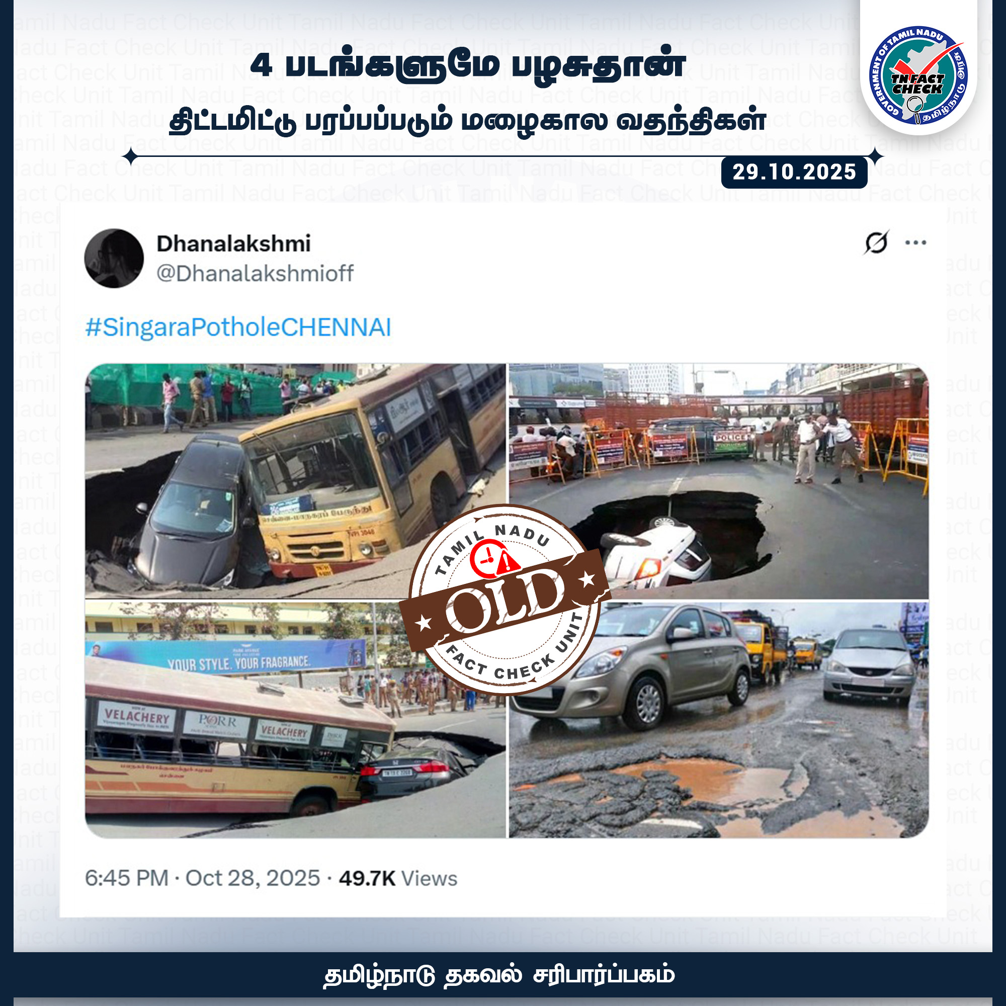 சென்னையில் மழையால் சாலைகளில் பள்ளம் ஏற்பட்டுள்ளதாகக் குறிப்பிட்டு 4 புகைப்படங்கள் பகிரப்பட்டு வருகின்றன.