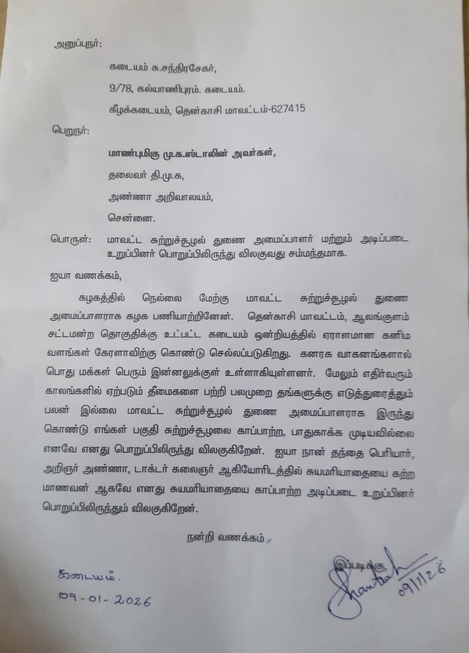 தென்காசி மாவட்டத் திமுக சுற்றுச்சூழல் அணித் துணை அமைப்பாளர் சு.சந்திரசேகர், தனது கட்சிப் பதவி மற்றும் அடிப்படை உறுப்பினர் பொறுப்பிலிருந்து விலகுவதாக அறிவித்து முதலமைச்சர் மு.க.ஸ்டாலினுக்குக் கடிதம் அனுப்பியுள்ளார்.