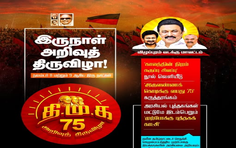 திமுகவின் 75 அறிவுத்திருவிழா நிகழ்ச்சி, அக்கட்சியின் இளைஞர் அணி சார்பில் சென்னையில் நாளை நடைபெறவுள்ளது. திமுக தலைவர், முதல்வர் மு.க.ஸ்டாலின் சென்னை வள்ளுவர் கோட்டத்தில் நாளை காலை 09.30 மணியளவில் 'காலத்தின் நிறம் கருப்பு சிவப்பு' நூலை வெளியிட்டு, 'இருவண்ணக்கொடிக்கு வயது 75' கருத்தரங்கத்தையும், முற்போக்கு புத்தகக்காட்சியையும் தொடங்கி வைக்கவுள்ளார்.