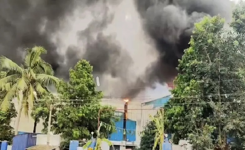 ஆயுதபூஜை மற்றும் விஜயதசமியை முன்னிட்டு தொழிற்சாலைக்கு இரண்டு நாட்கள் விடுமுறை அளிக்கப்பட்டுள்ள நிலையில், இன்று மாலை திடீரென தொழிற்சாலையில் தீப்பற்றி இருந்துள்ளது. இதனைக் கண்ட அப்பகுதி மக்கள் உடனடியாக தீயணைப்பு துறையினருக்கு தகவல் தெரிவித்துள்ளனர். விரைந்து வந்த தேர்வாய் சிப்காட் தீயணைப்பு துறை வீரர்கள் தீயை அணைக்க போராடிய நிலையில், தீ மளமளவென எரிந்ததால், அனைத்து பகுதிகளுக்கும் வேகமாக பரவி, கரும்புகை சூழ கொழுந்துவிட்டு எரிந்துள்ளது.