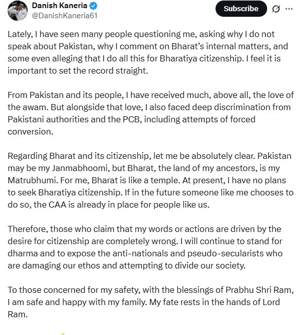 இந்தியாவுக்கு ஆதரவான கருத்துக்களை கூறி வரும் கனேரியா, இந்திய குடியுரிமை பெற முயற்சிப்பதாக குற்றச்சாட்டுகள் எழுந்துள்ள நிலையில், 'இந்தியா தன்னுடைய முன்னோர் வாழ்ந்த மண், இந்தியா எனக்கு கோவில் போன்றது' என்று கூறியுள்ளார்.