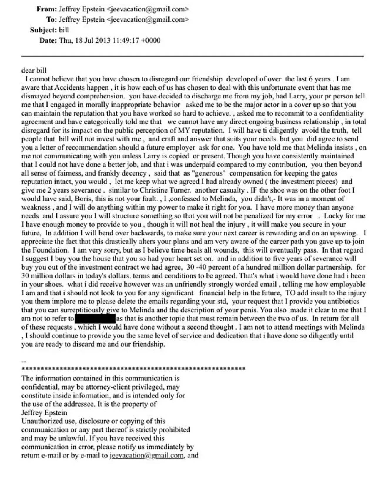 கடந்த 2013-இல் எப்ஸ்டீன் தனக்குத்தானே அனுப்பிக்கொண்ட மின்னஞ்சல்களில் பில் கேட்ஸ் குறித்து இத்தகைய தகவல்களைக் குறிப்பிட்டுள்ளார். அதில், மெலிண்டாவிற்குத் தெரியாமல் இருக்க எப்ஸ்டீனின் உதவியுடன் பில் கேட்ஸ் ஆன்டிபயாட்டிக் மருந்துகளைப் பெற்றதாக அதில் கூறப்பட்டுள்ளது. அத்துடன், இந்தச் சம்பவம் தொடர்பான மின்னஞ்சல்களை அழித்து விடுமாறு பில் கேட்ஸ் தன்னிடம் கோரியதாகவும் எப்ஸ்டீன் தனது குறிப்புகளில் எழுதியுள்ளார்.